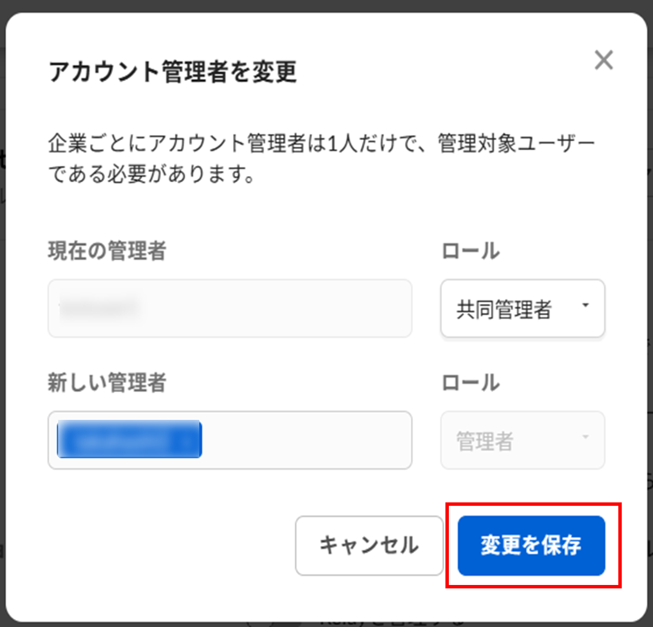 7. [新しい管理者] フィールドに、新しくBoxアカウント管理者になる管理対象ユーザーの名前を入力します。