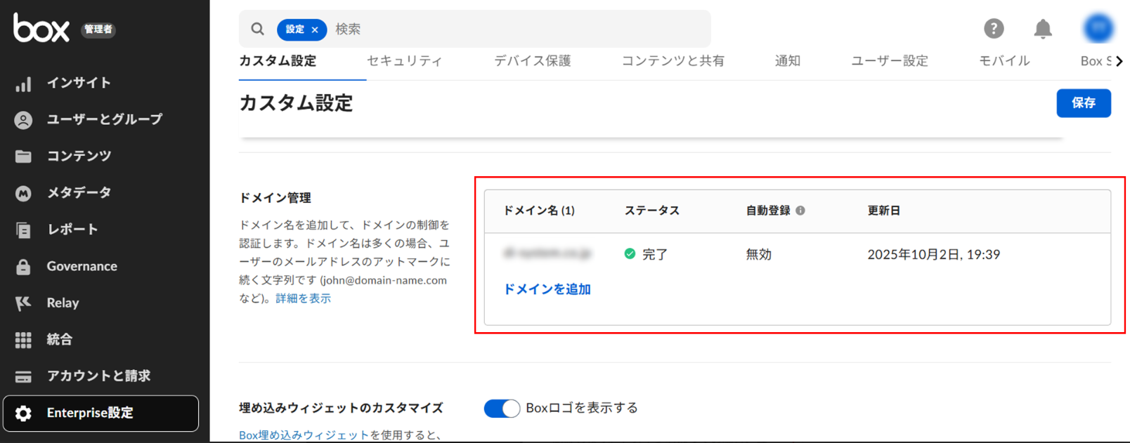 管理コンソール > Enterprise設定 > カスタム設定 > ドメイン管理