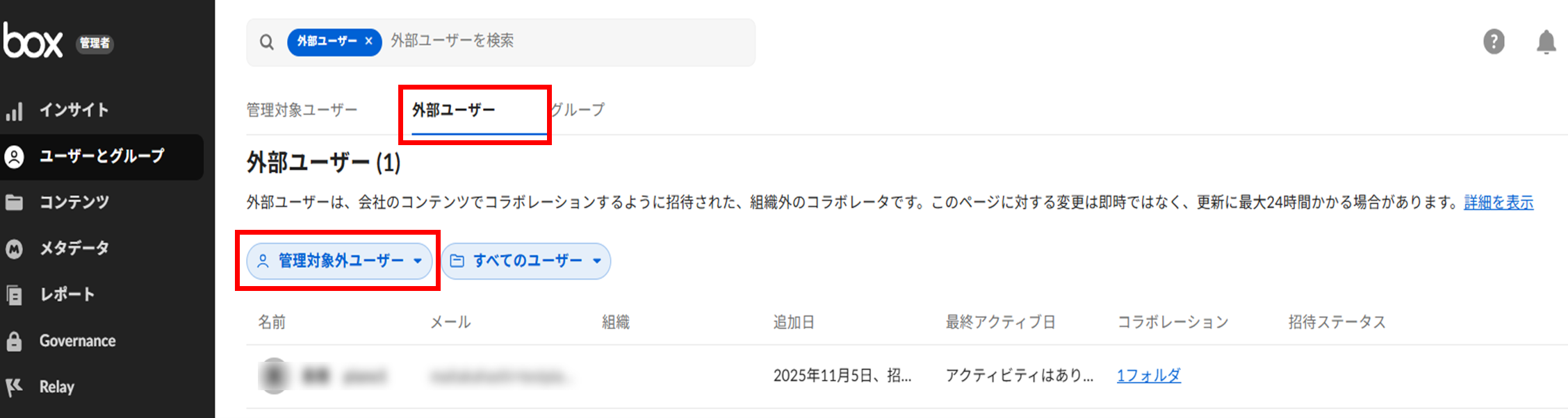 管理コンソール > ユーザーとグループ > 外部ユーザー タブにてドロップダウンから「管理対象外ユーザー」を選択すると確認できます。