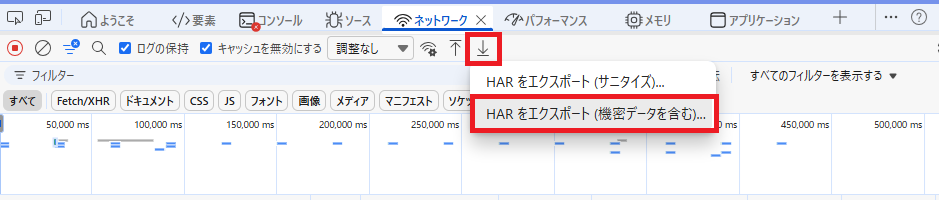 9.問題が再現したら下矢印を選択し、HARをエクスポート(機密データを含む)を選択し、ファイルを保存します。